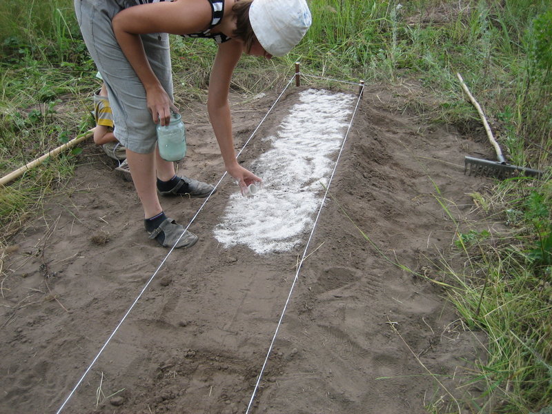 Вносим на гряду предпосевные удобрения: смесь № 1 (100 грамм на погонный метр гряды). А затем и смеь № 2 (50 гр. на метр).