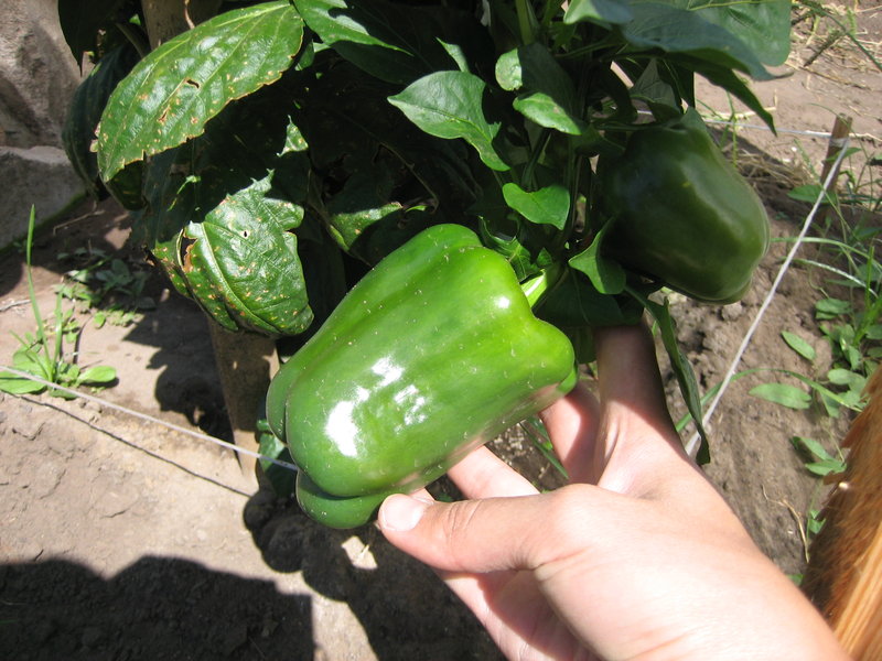Остроносый перчик, обнаруженный только сейчас, зажат шпагатом, с помощью которого подвязан перец к опоре.