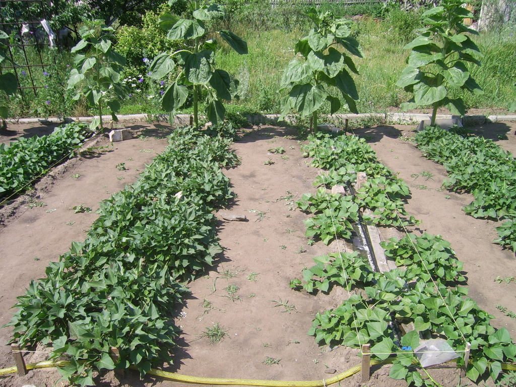 Итак, 3 июня (так как не обещали заморозков, решили пораньше) мы посадили две гряды батата Победа-100, с различным расстоянием между кустами (52 и 64 см).
