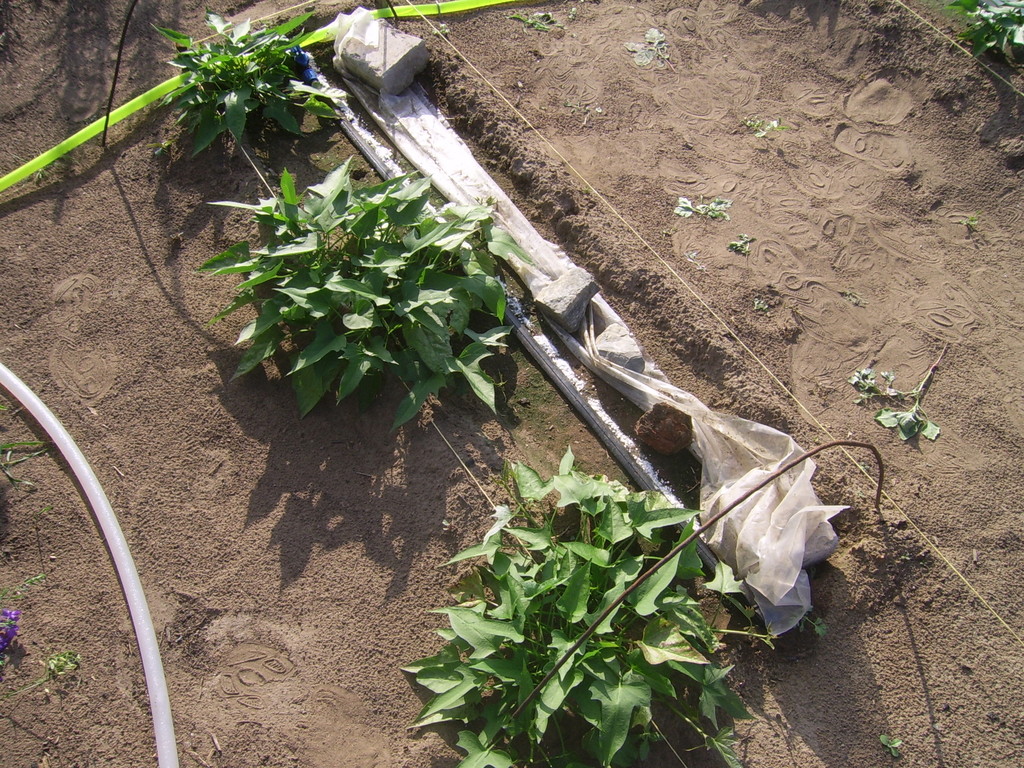7 августа (92 дня с момента посадки черенков). Гряда батата Победа-100, в расстил. Однорядная посадка.